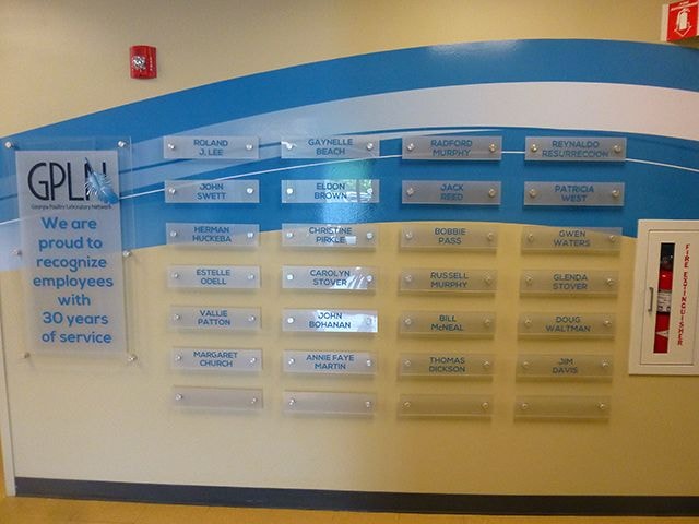 Acrylic plastic signs: Made from a cast polymer that’s transparent, colorless and durable, acrylic is an ideal substitute for glass. Acrylic signs are readily customizable. For example, we can print UV ink directly onto acrylic. Alternately, or in addition to printing, we can attach vinyl lettering or decals to acrylic to create custom signage. Because of its beauty, clarity and depth, acrylic is often the choice in creating plastic lobby signs or plastic architectural signage.