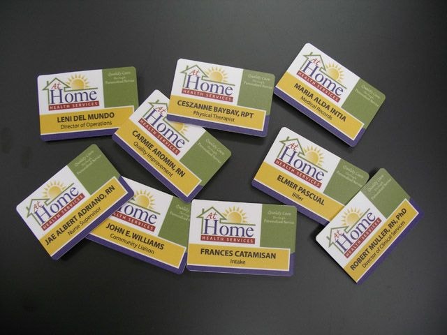 Name badges, IDs and name tags can be manufactured with magnetic backs to prevent damage to clothing, on paper or plastic to be placed in a plastic cover, or built to hang around your neck with a lanyard.